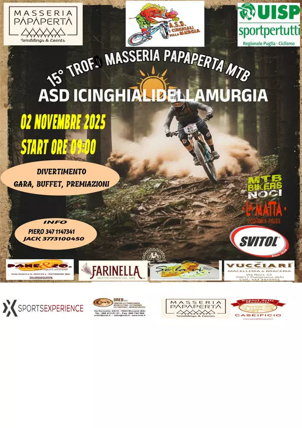 Il Team ICINGHIALIDELLAMURGIA in collaborazione con la UISP PUGLIA, Comitati di Bari e Taranto è lieta di presentarvi ed organizzare per domenica 02 NOVEMBRE 2025 in Putignano (BA) , un evento non agonistico di Country XC denominata XIII° TROFEO MASSERIA PAPAPERTA MTB.