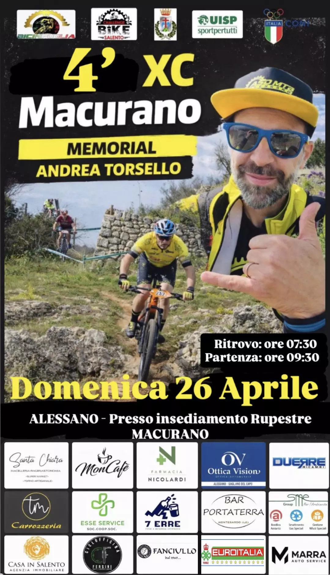 La 4ª XC MACURANO – MEMORIAL ANDREA TORSELLO, 3ª tappa in calendario del circuito CHALLENGE BIKE SALENTO 2026 - UISP, si svolgerà Domenica 26 Aprile 2026 ad Alessano.